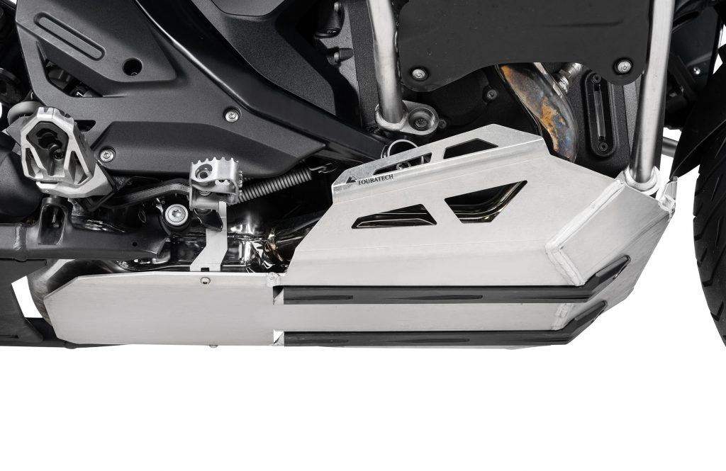 Zubehörspezialist Touratech bringt mit dem „Motorschutz Expedition XL“ eine besonders groß dimensionierte Schutzplatte für die BMW R 1300 GS und deren Adventure-Schwestermodell. Der XL-Schutz ist vorne und seitlich höher gezogen und reicht bis unter den Sammler, um Ölwanne und Motorgehäuse im Offroad-Betrieb besser vor Steinschlag, Aufsetzern und grobem Terrain zu bewahren.